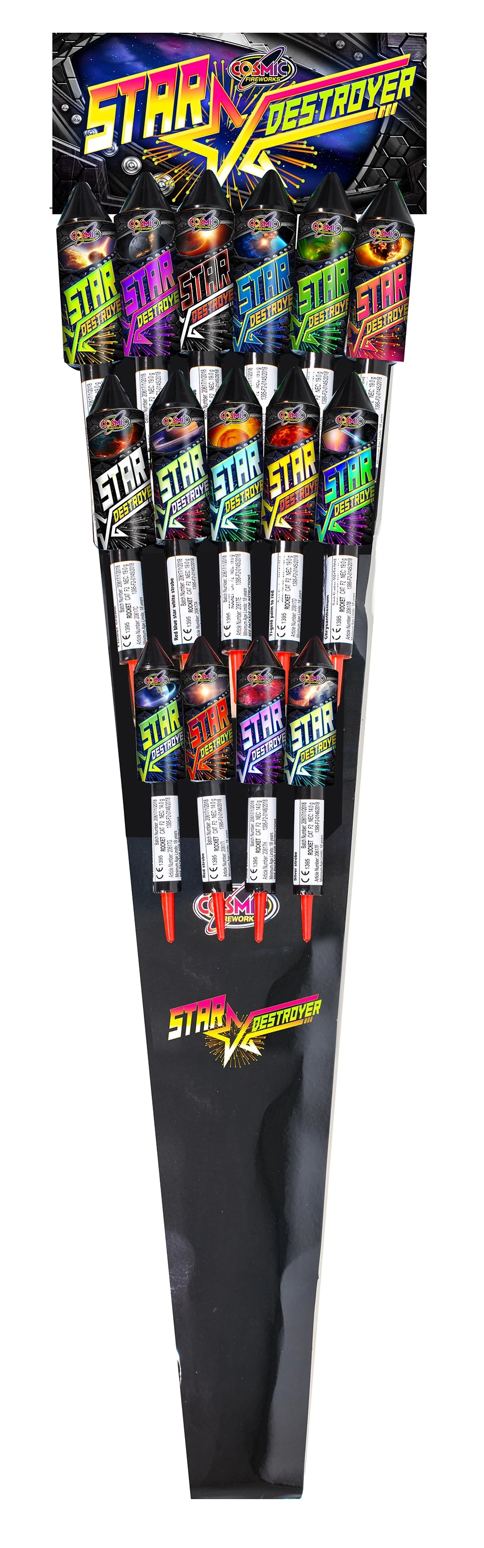 Unleash a celestial spectacle with the Star Destroyer Rocket Pack from Cosmic Fireworks. This 15-piece assortment features a variety of rocket sizes, each delivering vibrant bursts of colour and dynamic effects. Expect waves of chrysanthemum blooms, coloured dahlia effects with silver glitter, and an array of strobe effects that light up the night sky. With a 1.4G hazard classification and an 8m safety distance, these rockets are designed for professional-grade displays. Perfect for large gatherings, bonfire nights, or any event where you want to make a lasting impression.